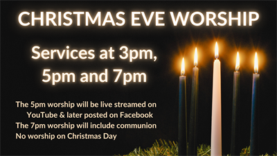 Join us at First Lutheran Church in Marshall (100 Church Street) for Christmas Eve Candlelight worship on Wednesday, December 24th at 3pm 5pm or 7pm. The 5pm worship will be live streamed on YouTube and later posted on Facebook. The 7pm worship will include communion. All are welcome.