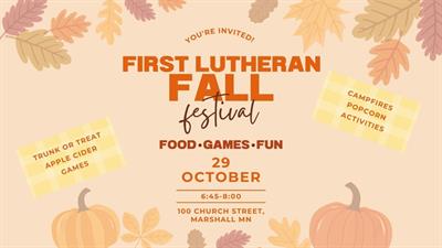 Bring the whole family to First Lutheran's first Fall Festival! It will be a night filled with Trunk-or-Treat, activities, games, campfires, popcorn, apple cider, and MORE! Mark it on your calendars, you won't want to miss it!